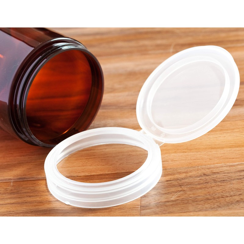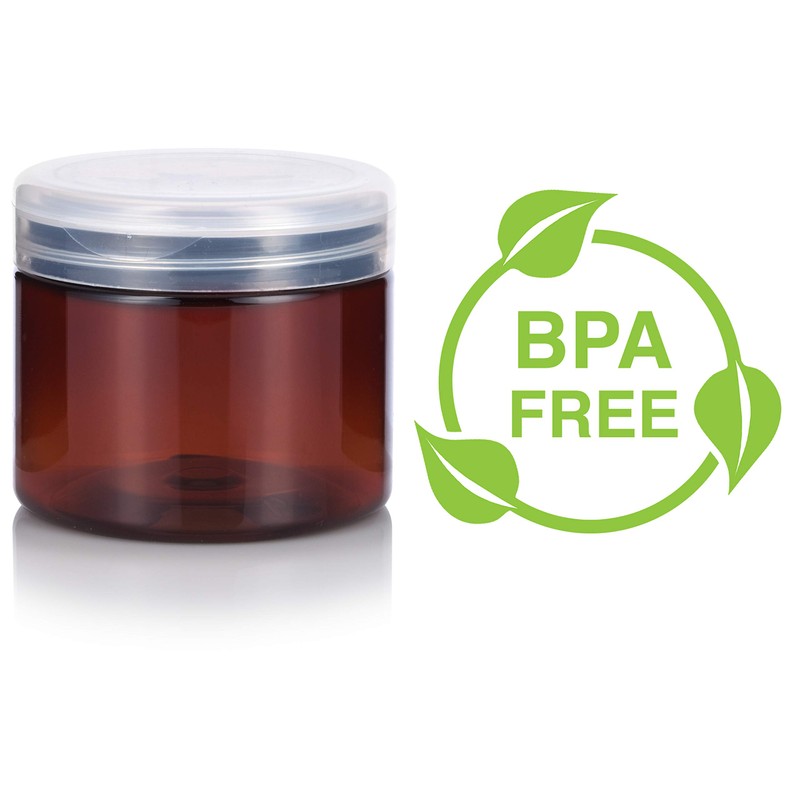 • Includes 6 - 6 oz / 177 ml Amber PET plastic shallow low profile jars with clear natural flip top caps