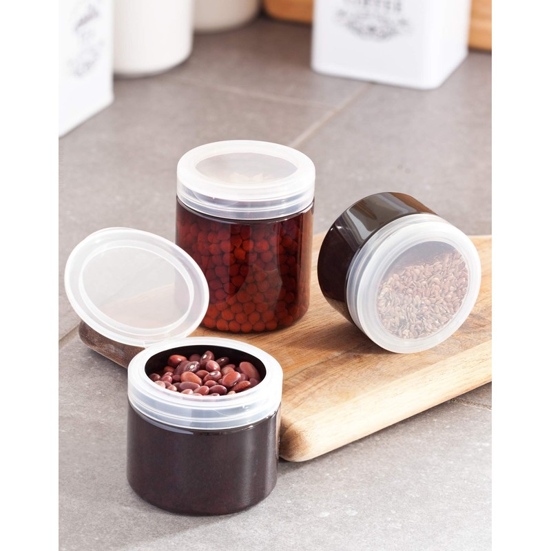 Includes 6 - Amber refillable / reusable plastic jars with Clear natural flip top cap, spatulas and labels for each jar for optional use. Each jar holds 6 ounces. Perfect for travel, home and kitchen use, beauty, crafts and gifts. Low profile shallow jar makes contents easy to access.