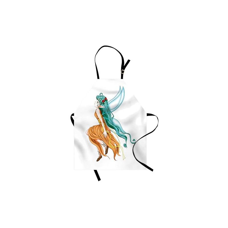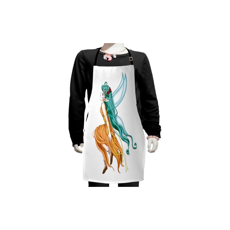 Ambesonne Anime Apron, Pixie Girl Caricature with a Long Green Hair and Wings Fantasy Elf, Small Apron Bib with Adjustable Ties for Baking Painting, Small Size, Sea Green Ginger