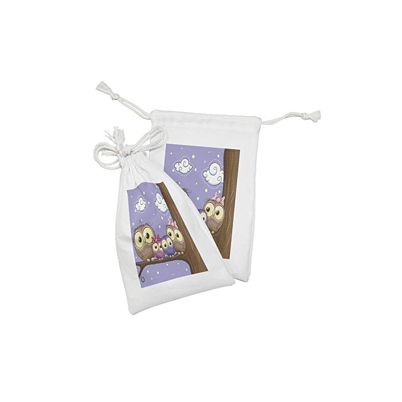 Ambesonne Bird Fabric Pouch Set of 2, Cartoon Style Owl Bird Family Mother Father Daughter Son Sitting on a Branch, Small Drawstring Bag for Toiletries Masks and Favors, 9" x 6", Lavender and Brown