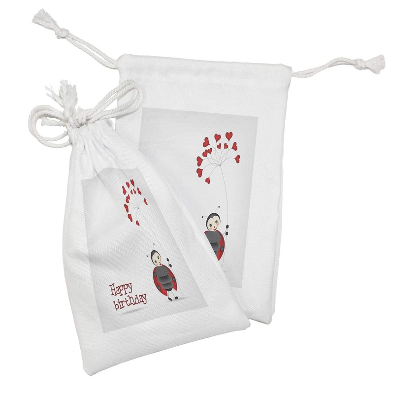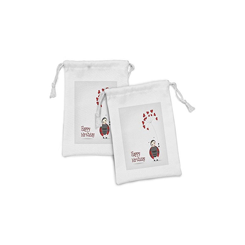 Ambesonne Birthday Party Fabric Pouch Set of 2, Ladybug Wings Flower Inspired Heart Shaped Celebration Balloons, Small Drawstring Bag for Toiletries Masks and Favors, 9" x 6", White Black and Red