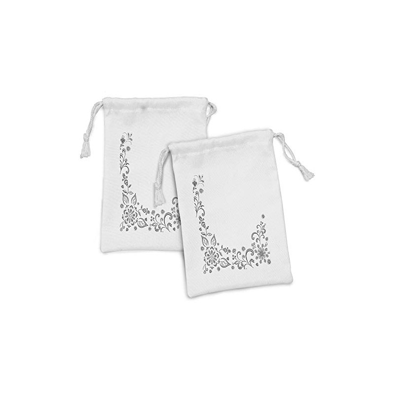 Ambesonne Black and White Fabric Pouch Set of 2, Monochrome Floral Framework Herbs Swirled Leaves Botanical Sketchy Bouquet, Small Drawstring Bag for Toiletries Masks and Favors, 9" x 6", Black White