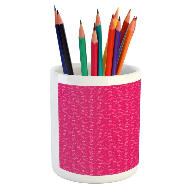 Ambesonne Cactus Print Pencil Pen Holder, Outline Drawing of Hearts and Pots Drawn by Hand Valentine's Day Theme, Ceramic Pencil Holder for Desk Office Accessory, 3.6" X 3.2", Magenta and White