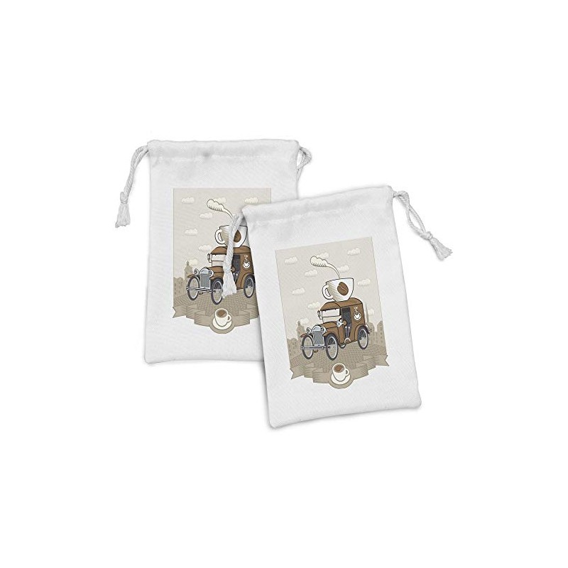 Ambesonne Cars Fabric Pouch Set of 2, Old Fashioned Car with Coffee Cup on the Top Caffeine Beverage Hot Drink, Small Drawstring Bag for Toiletries Masks and Favors, 9" x 6", Caramel Cocoa White
