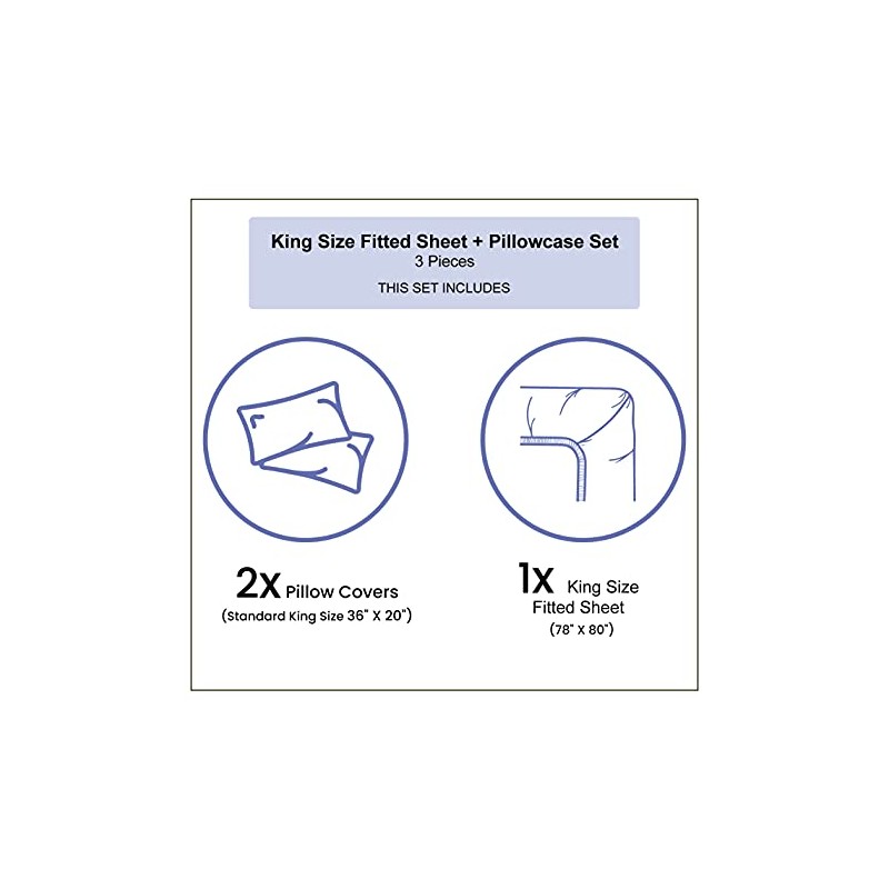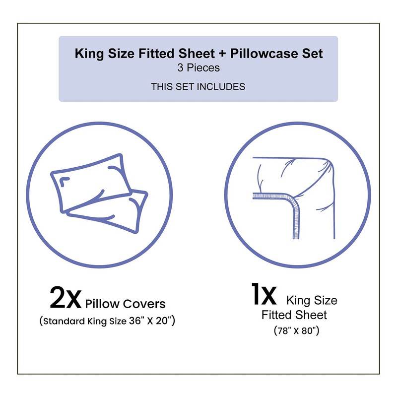 • Measurements - 1 king size sheet 78" wide X 80" long & 2 pillow shams 36" wide X 20" long.