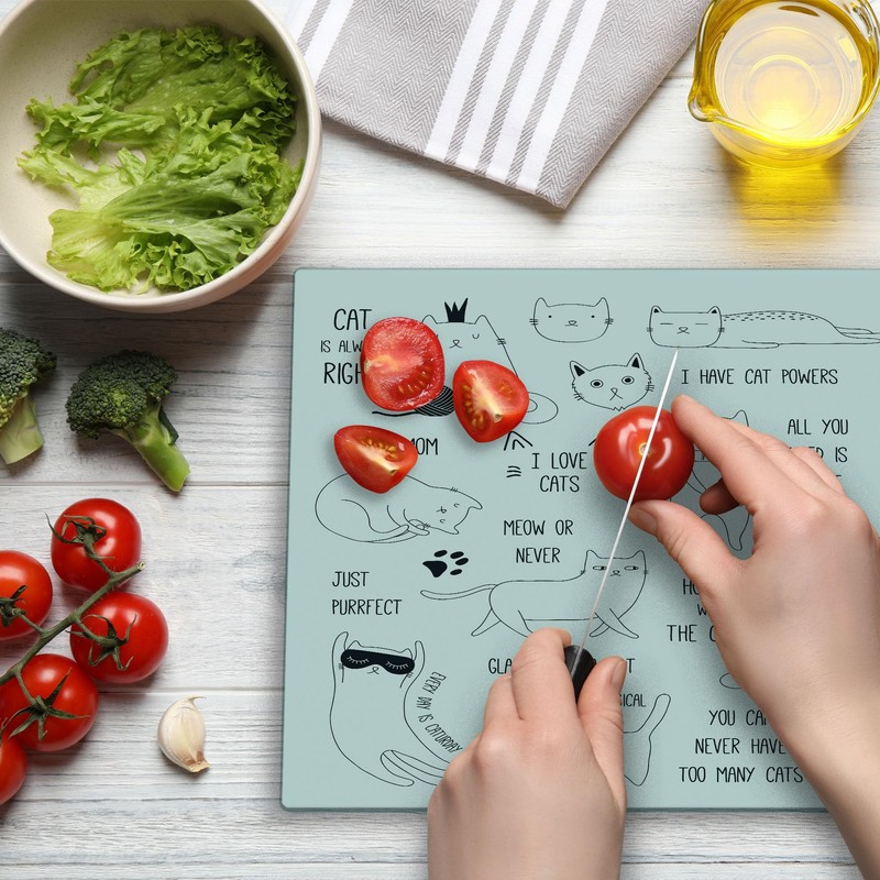 Ambesonne Cats Cutting Board, Doodle Composition of Animals with Various Words Hand Drawn Design, Decorative Tempered Glass Cutting and Serving Board, Large Size, Dark Chestnut Brown and White