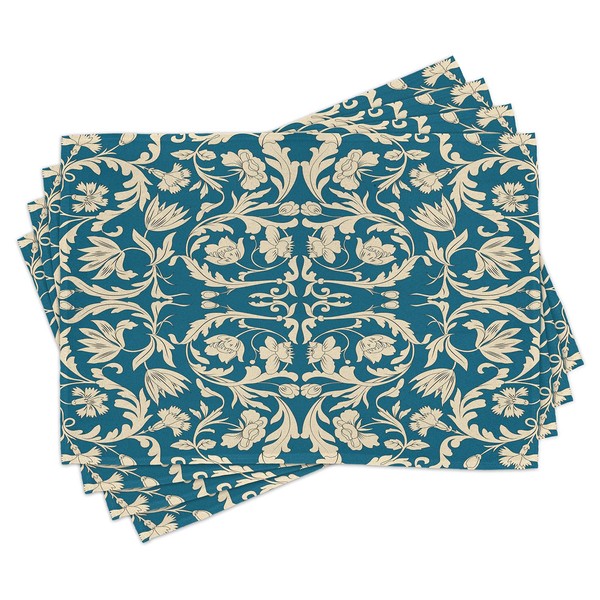 Ambesonne Chinese Place Mats Set of 4, Far Eastern Scroll Pattern with Floral Curls Oriental Flourish, Washable Fabric Placemats for Dining Room Kitchen Table Decor, Petrol Blue and Cream