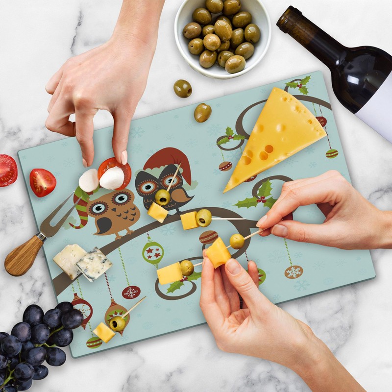 Ambesonne Christmas Cutting Board, Owls on Celebrating Twiggy Tree Branches Annual Yule Noel Christmas Themed Print, Decorative Tempered Glass Cutting and Serving Board, Large Size, Grey Brown