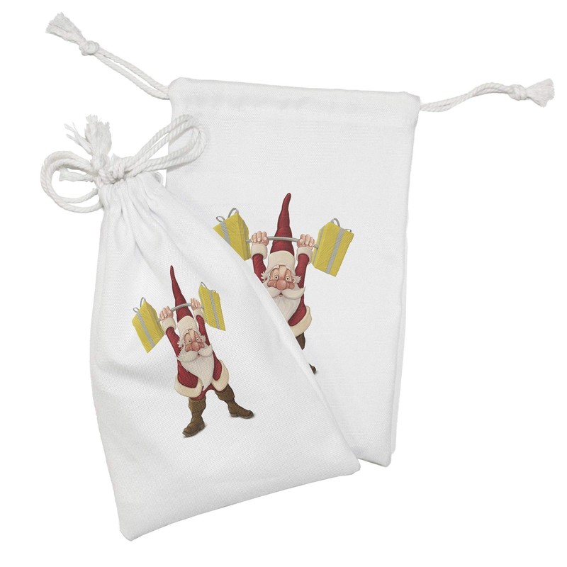 Ambesonne Christmas Fabric Pouch Set of 2, Whimsical Scene of Old Santa Lifts a Barbell with Gift Boxes Noel Vibes, Small Drawstring Bag for Toiletries Masks and Favors, 9" x 6", Ruby Brown Yellow