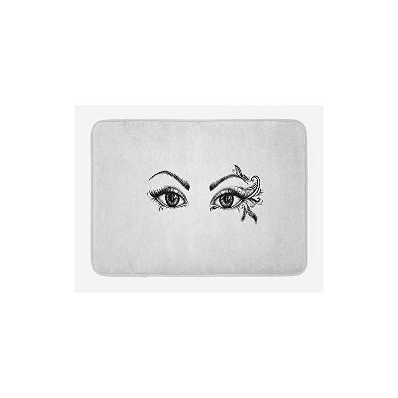 Ambesonne Eyelash Bath Mat, Monochrome Drawing of Young Woman Eyes Feathers Butterfly Floral Details, Plush Bathroom Decor Mat with Non Slip Backing, 30.2" x 20", Black White