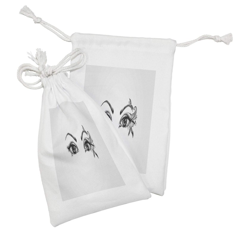 Ambesonne Eyelash Fabric Pouch Set of 2, Monochrome Drawing of Young Woman Eyes Feathers Butterfly Floral Details, Small Drawstring Bag for Toiletries Masks and Favors, 9" x 6", Black White