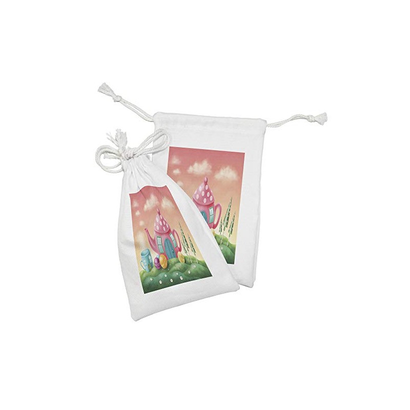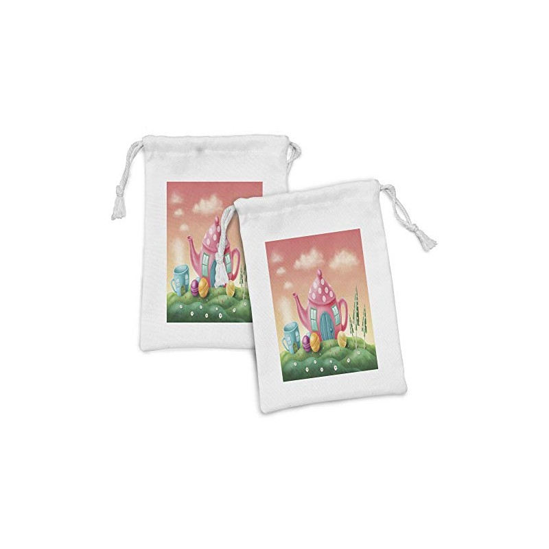 Ambesonne Fantasy Fabric Pouch Set of 2, Polka Dotted Fantasy Tea Pot and Coffee Cup House Surrounded by Lollipops, Small Drawstring Bag for Toiletries Masks and Favors, 9" x 6", Fern Green and Coral