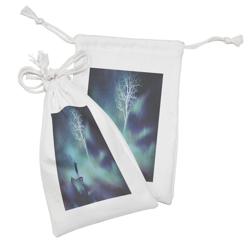 Ambesonne Fantasy World Fabric Pouch Set of 2, Man on a Boat in the Outer Space Along Tree Stars Cosmos Digital Art, Small Drawstring Bag for Toiletries Masks and Favors, 9" x 6", Turquoise Purple