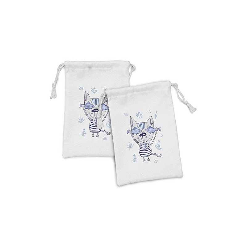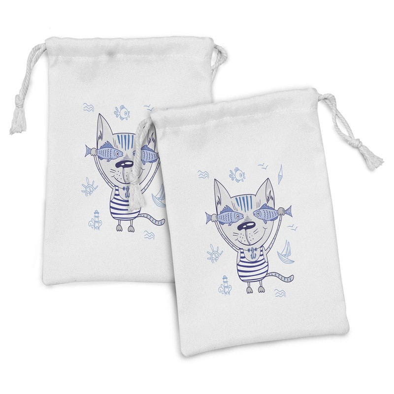 Ambesonne Fish Fabric Pouch Set of 2, Naughty Cat Fish in Striped T-shirt Anchor Pendant and Nautical Maritime Sign, Small Drawstring Bag for Toiletries Masks and Favors, 9" x 6", Blue Grey