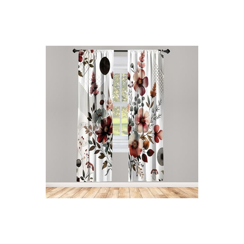 Ambesonne Floral Window Curtains, Mid Century Modern Rounds Chevrons and Stripes Ornate Leafy Wildflowers, Lightweight Decorative 2-Panel Set & Rod Pocket, Pair of - 28" x 95", Maroon Dark Sea Green