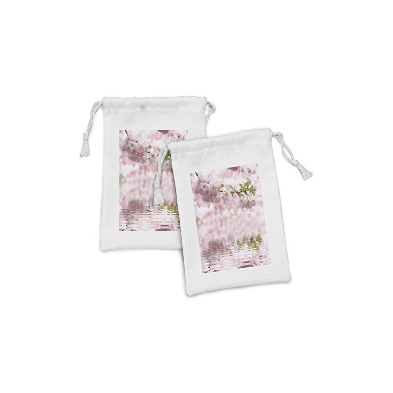 Ambesonne Flower Fabric Pouch Set of 2, Tender Pastel Pink Tones Floral Branch on Rippling Water with Reflection, Small Drawstring Bag for Toiletries Masks and Favors, 9" x 6", Pale Pink Fern Green