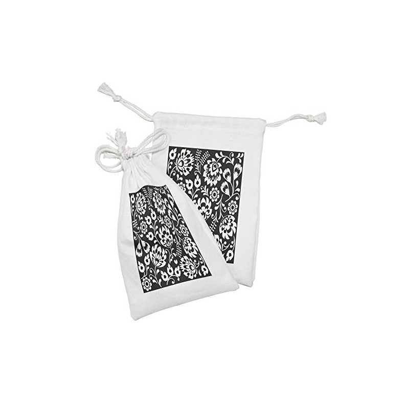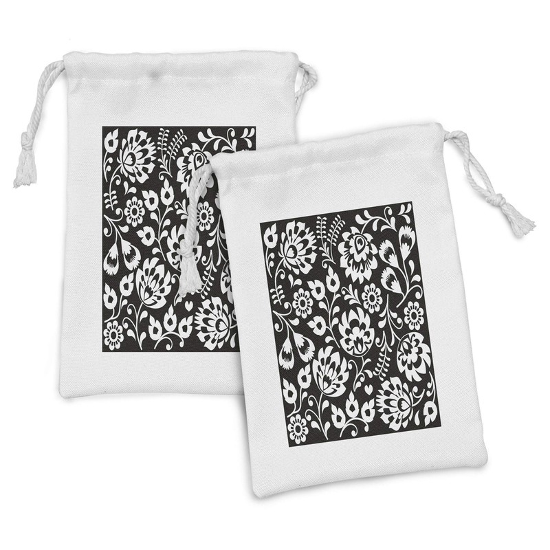 Ambesonne Folk Art Fabric Pouch Set of 2, Monochromatic Polish Traditional Botanical Motifs Flowers with Peduncles, Small Drawstring Bag for Toiletries Masks and Favors, 9" x 6", Charcoal Grey White