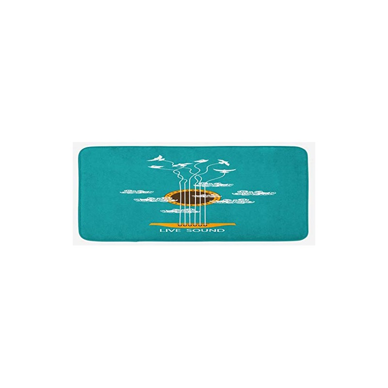 Ambesonne Guitar Kitchen Mat, Abstract Music Themed with Birds on Strings and Clouds Illustration, Plush Decorative Kitchen Mat with Non Slip Backing, 47" X 19", Turquoise Marigold White