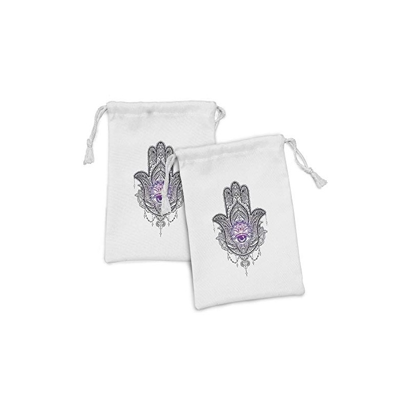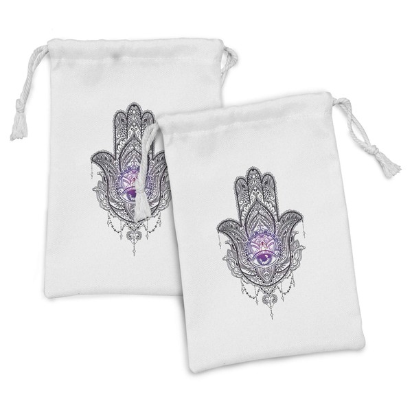 Ambesonne Hamsa Fabric Pouch Set of 2, Motifs from Cultures Exotic Orient Inspired Paisleys and Flowers Teardrop, Small Drawstring Bag for Toiletries Masks and Favors, 9" x 6", Purple White and Black