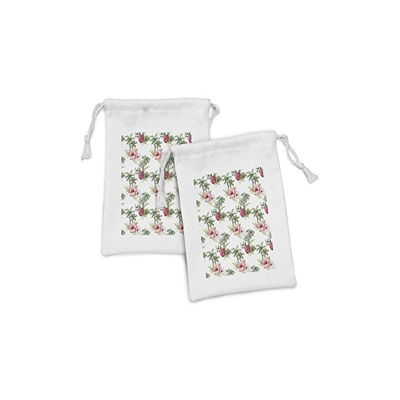 Ambesonne Hawaii Fabric Pouch Set of 2, Aquarelle Effect Palm Trees Hibiscus Flowers Romantic Summer Bloom, Small Drawstring Bag for Toiletries Masks and Favors, 9" x 6", Reseda Green Pale Pink