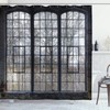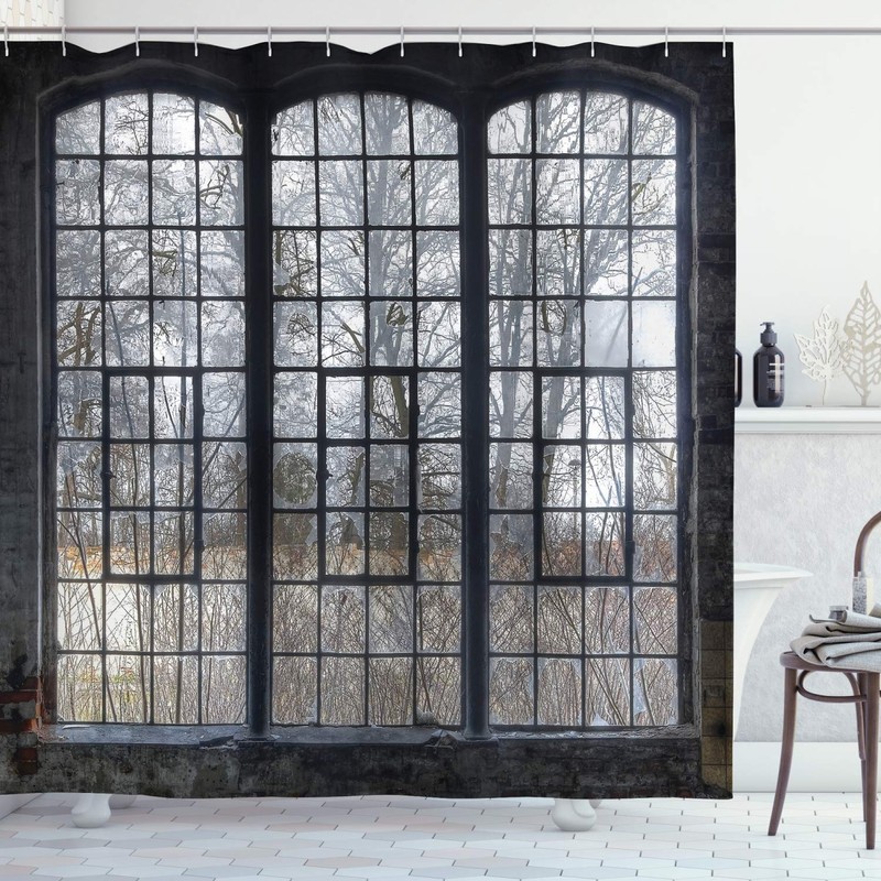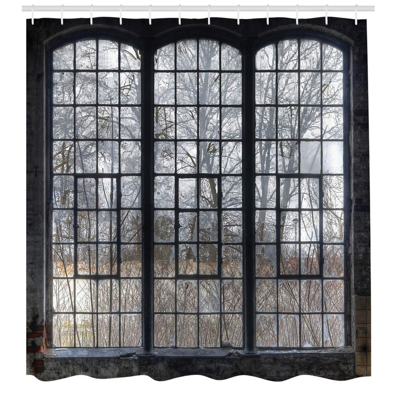 Ambesonne Industrial Shower Curtain, Old Large Window with Broken Panes Deserted Hall Forest Trees Winter, Cloth Fabric Bathroom Decor Set with Hooks, 75" Long, Green White