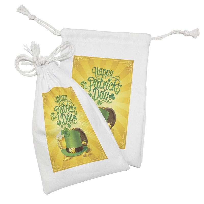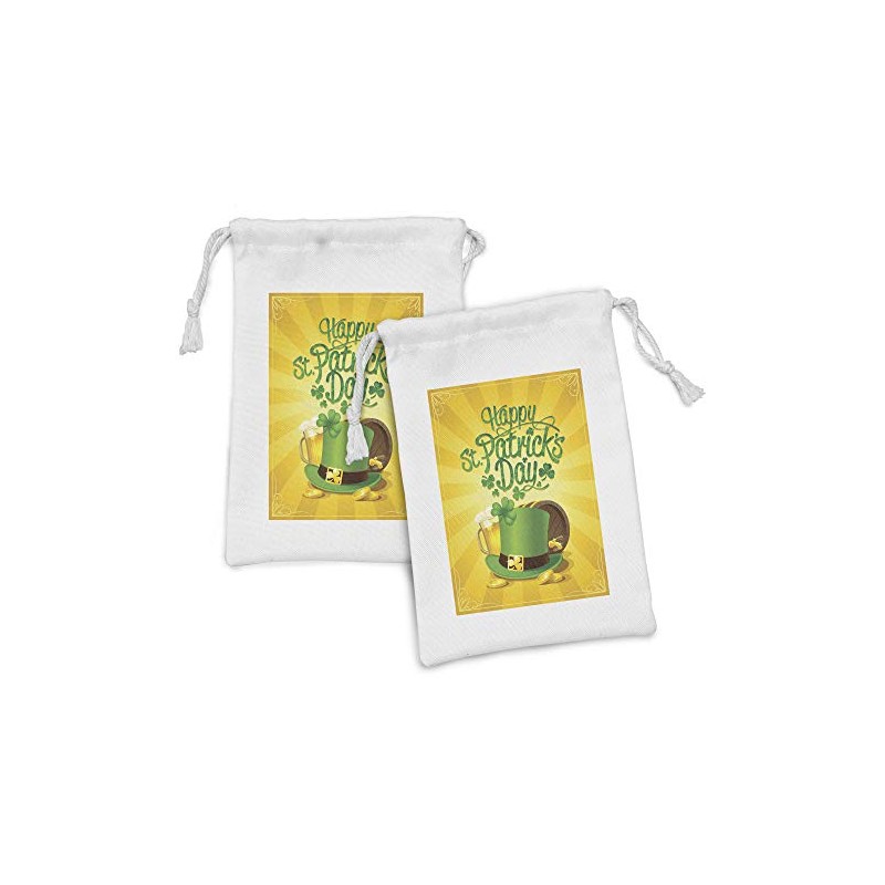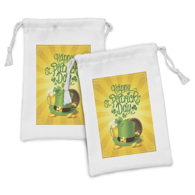 Ambesonne Irish Pub Fabric Pouch Set of 2, St Patrick's Day Celebration with Beer Clover Leprechaun Hat, Small Drawstring Bag for Toiletries Masks and Favors, 9" x 6", Earth Yellow Green