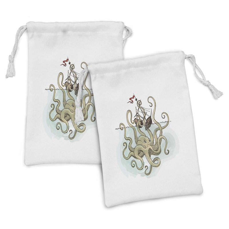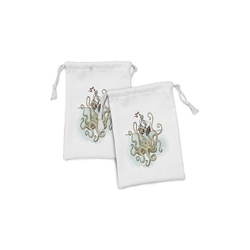 Ambesonne Kraken Fabric Pouch Set of 2, Octopus Sinking the Pirate Ships Greek Myth Fish Culture Cartoon Artwork Image, Small Drawstring Bag for Toiletries Masks and Favors, 9" x 6", Tan Pale Green
