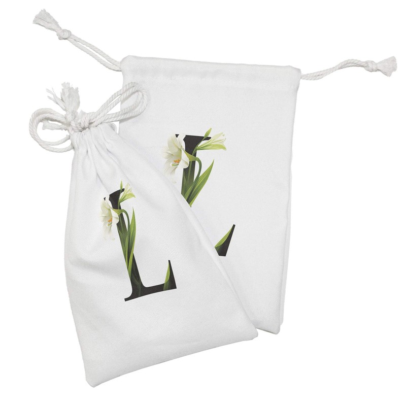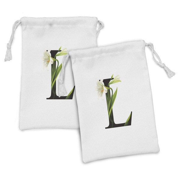 Ambesonne Letter L Fabric Pouch Set of 2, Conceptual ABC Typography Capital L with Lily Flourish Floral Natural Grace, Small Drawstring Bag for Toiletries Masks and Favors, 9" x 6", Green White Black