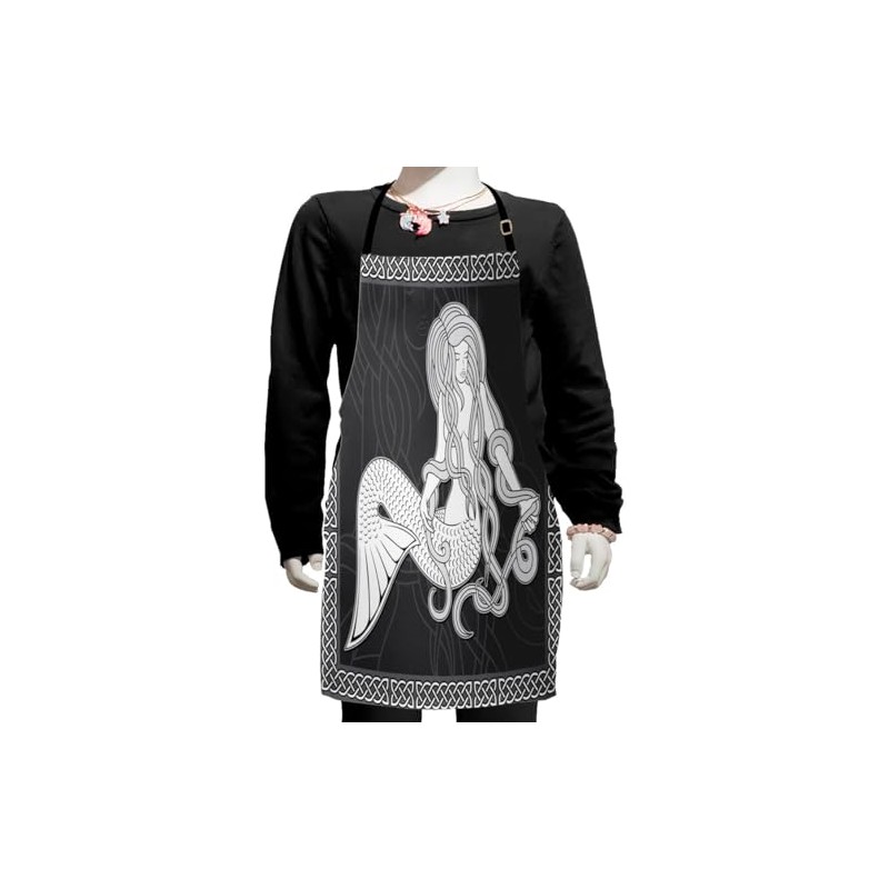Ambesonne Mermaid Apron, Retro Art Illustration of a Girl Brushing Hair and Border Celtic Patterns, Small Apron Bib with Adjustable Ties for Baking Painting, Small Size, Brown White