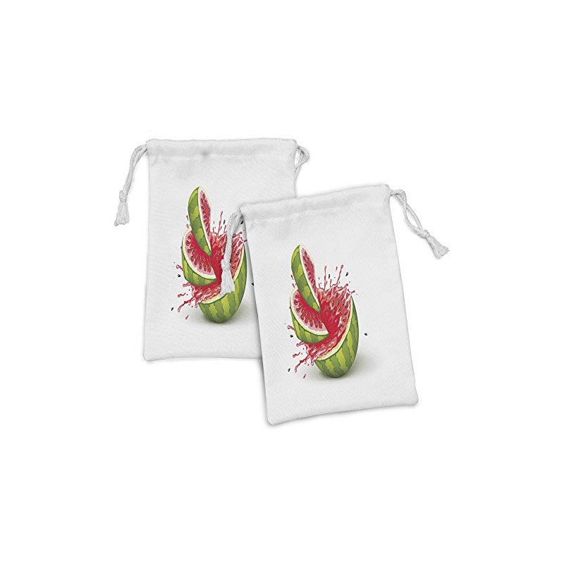 Ambesonne Modern Fabric Pouch Set of 2, Summer Fruit Ripe Watermelon Cuts Splashes of Juice Drops Print, Small Drawstring Bag for Toiletries Masks and Favors, 9" x 6", Red White and Fern Green