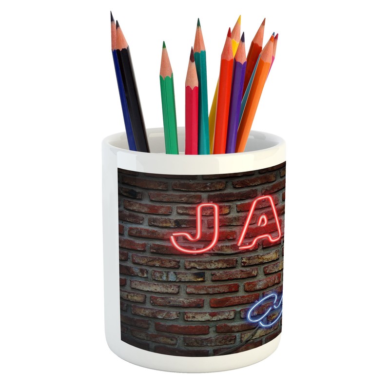 Ambesonne Music Pencil Pen Holder, Image of Alluring Neon All Jazz Sign with Saxophone Instrument on Brick Wall Print, Printed Ceramic Pencil Pen Holder for Desk Office Accessory, Red Blue