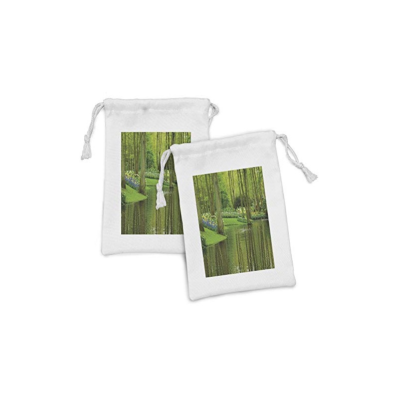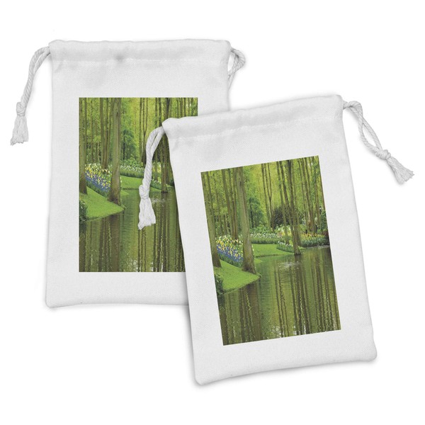 Ambesonne Nature Fabric Pouch Set of 2, Forest with Lake Dutch Garden Pastoral Woodland Botany Flowerbed Picture, Small Drawstring Bag for Toiletries Masks and Favors, 9" x 6", Fern and Lime Green