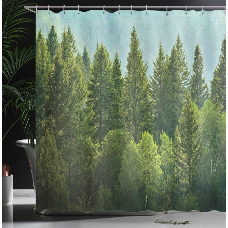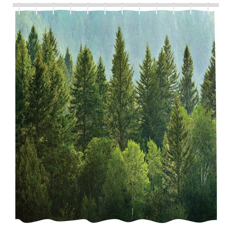 Ambesonne Nature Shower Curtain, Forest Pine Tree Tops Refreshing Eco Woodland Wilderness Mountainside Landscape Print, Cloth Fabric Bathroom Decor Set with Hooks, 69" W x 84" L, Green Teal