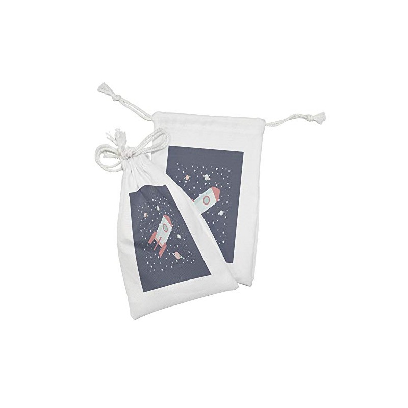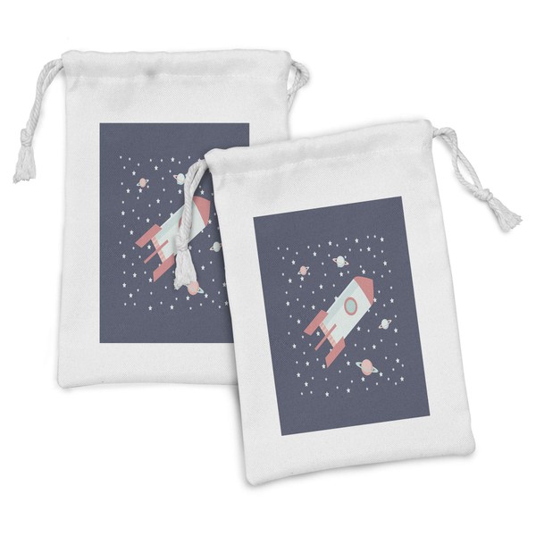 Ambesonne Outer Space Fabric Pouch Set of 2, Galaxy Themed Cartoon with Rocket Stars and Planets, Small Drawstring Bag for Toiletries Masks and Favors, 9" x 6", Coral Dark Indigo