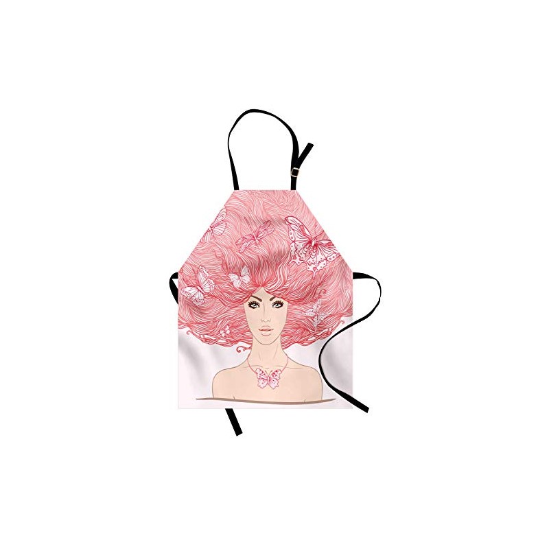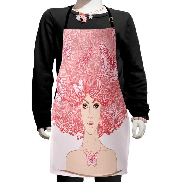 Ambesonne Pink Apron, Sketchy Hand Drawn Style Girl with Butterflies in Her Long Pink Hair Illustration, Small Apron Bib with Adjustable Ties for Baking Painting, Small Size, Coral and White