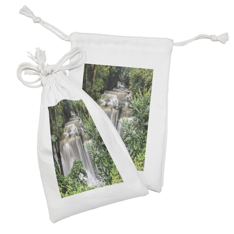 Ambesonne Rainforest Fabric Pouch Set of 2, Huay Mae Khamin Waterfall in Tropical Rainforest Thailand Holiday Travel Theme, Small Drawstring Bag for Toiletries Masks and Favors, 9" x 6", Green Brown