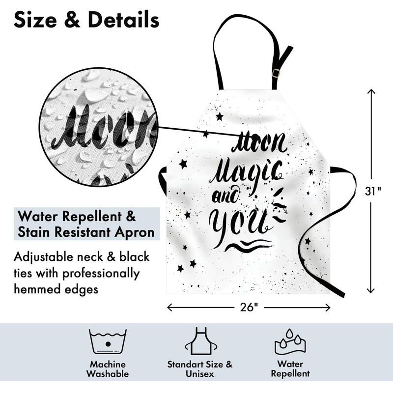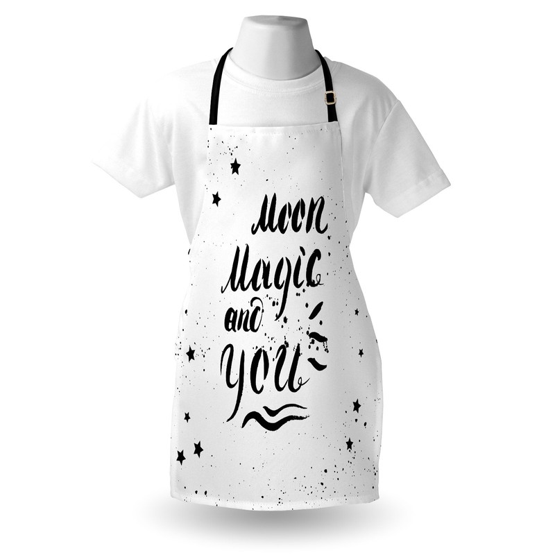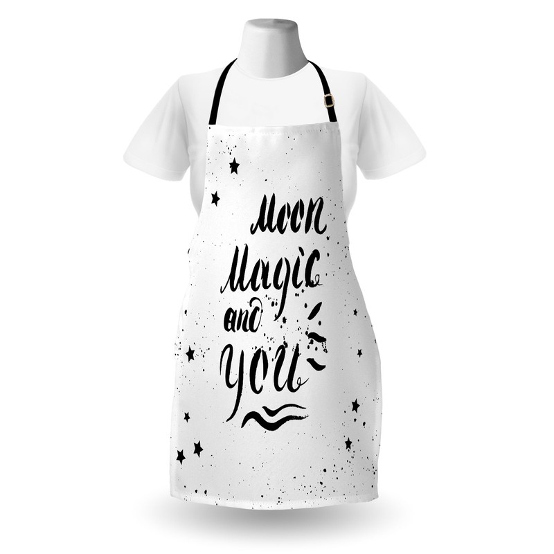 Ambesonne Romantic Apron, Moon Magic and You Inspirational Messy Modern Brush Pen Calligraphy with Stars, Unisex Kitchen Bib Apron with Adjustable Neck for Cooking Baking Gardening, Black White