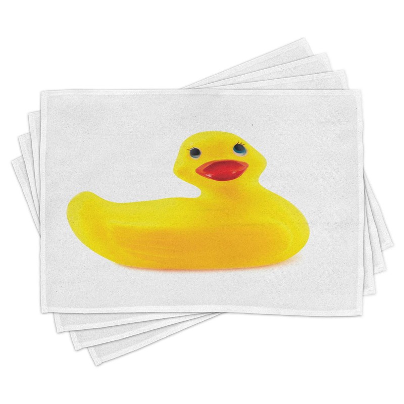 Ambesonne Rubber Duck Place Mats Set of 4, Yellow Squeak Ducky Toy Fun Bubble Bath Animal Room Duckling Print, Washable Fabric Placemats for Dining Table, Standard Size, White and Yellow