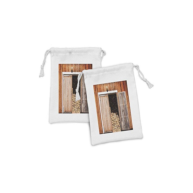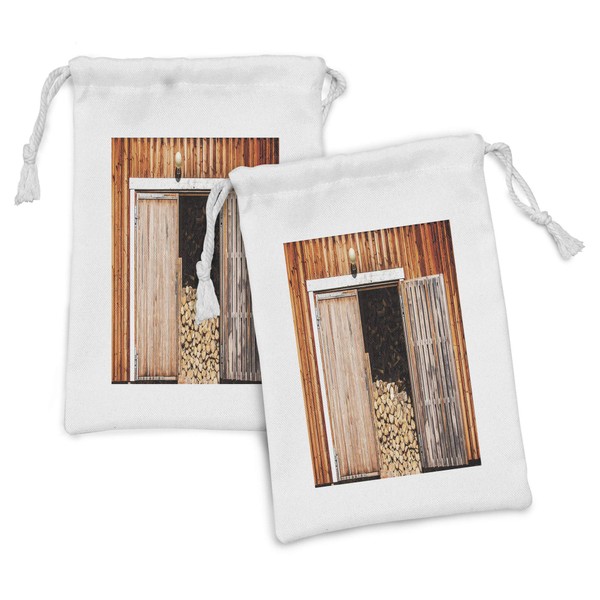 Ambesonne Rustic Fabric Pouch Set of 2, Weathered Barn Firewood Countryside Village Storage Garden Rural Life Concept, Small Drawstring Bag for Toiletries Masks and Favors, 9" x 6", Orange Brown