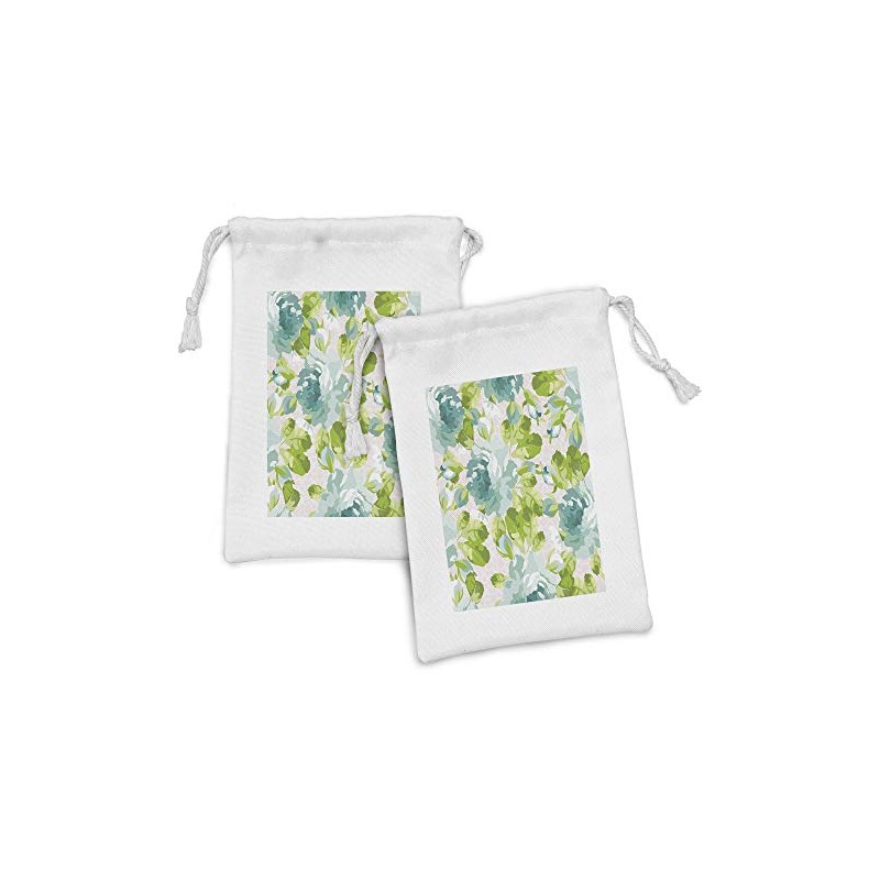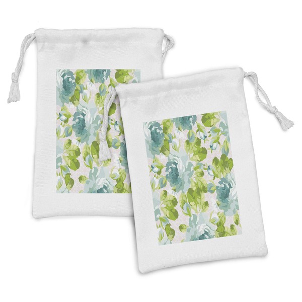 Ambesonne Shabby Flora Fabric Pouch Set of 2, Tropical Botany Garden Theme Blue Roses Leaves and Bouquets, Small Drawstring Bag for Toiletries Masks and Favors, 9" x 6", Turquoise Pale Pink