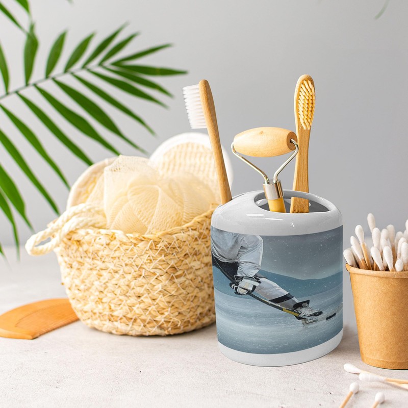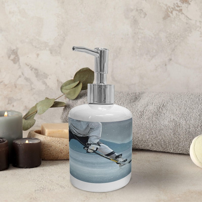 Ambesonne Sports Soap Dispenser & Toothbrush Holder Set, Ice Hockey Player with Stick and Puck Mountain Background Canadian, Ceramic Bathroom Toiletry Accessories, 2 Pcs, Charcoal Grey White