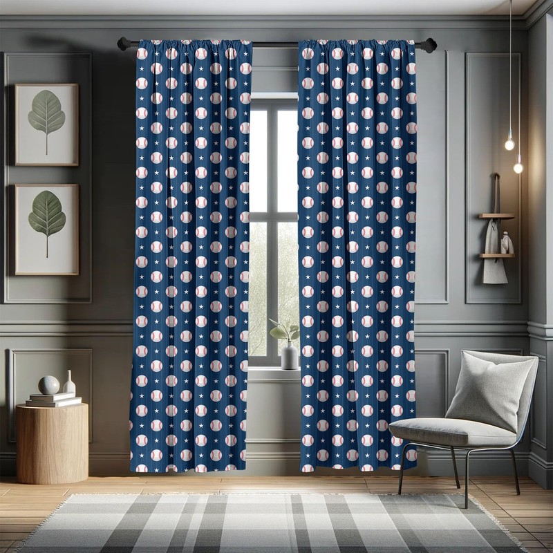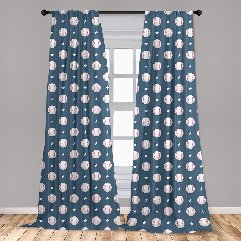 Ambesonne Sports Window Curtains, Baseball Patterns on Vertical Striped Background Stars Design, Lightweight Decor 2-Panel Set with Rod Pocket, Pair of - 28" x 95", Blue Red