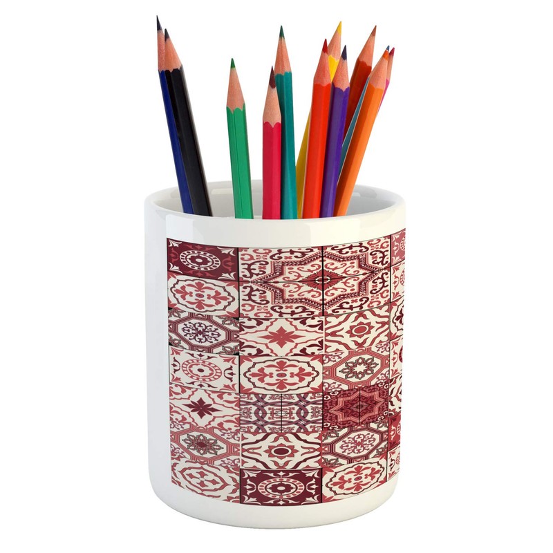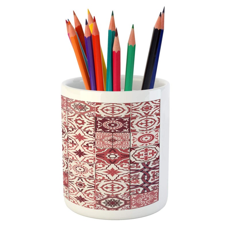 Ambesonne Traditional Pencil Pen Holder, Pattern of Moroccan Inspired Tile Like Squares Ornamental Eastern Details, Ceramic Pencil Holder for Desk Office Accessory, 3.6" X 3.2", Maroon Pale Ruby