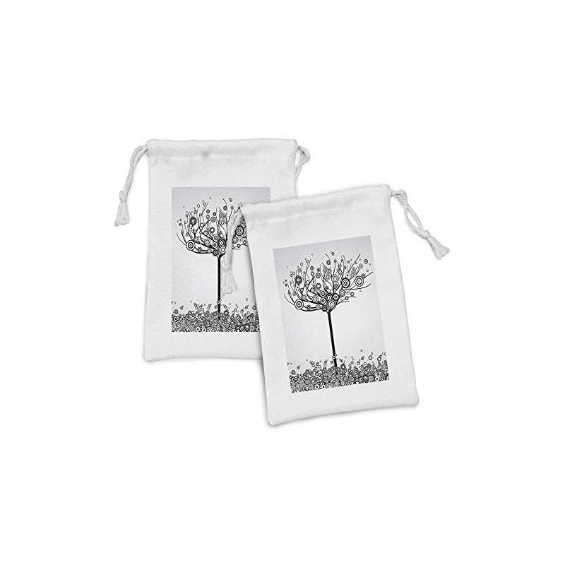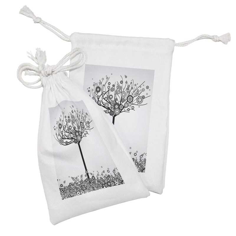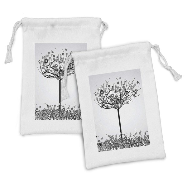 Ambesonne Tree of Life Fabric Pouch Set of 2, Abstract Image Circle Leaves and Round Plants Spiral Dot Illustration Design, Small Drawstring Bag for Toiletries Masks and Favors, 9" x 6", Black White