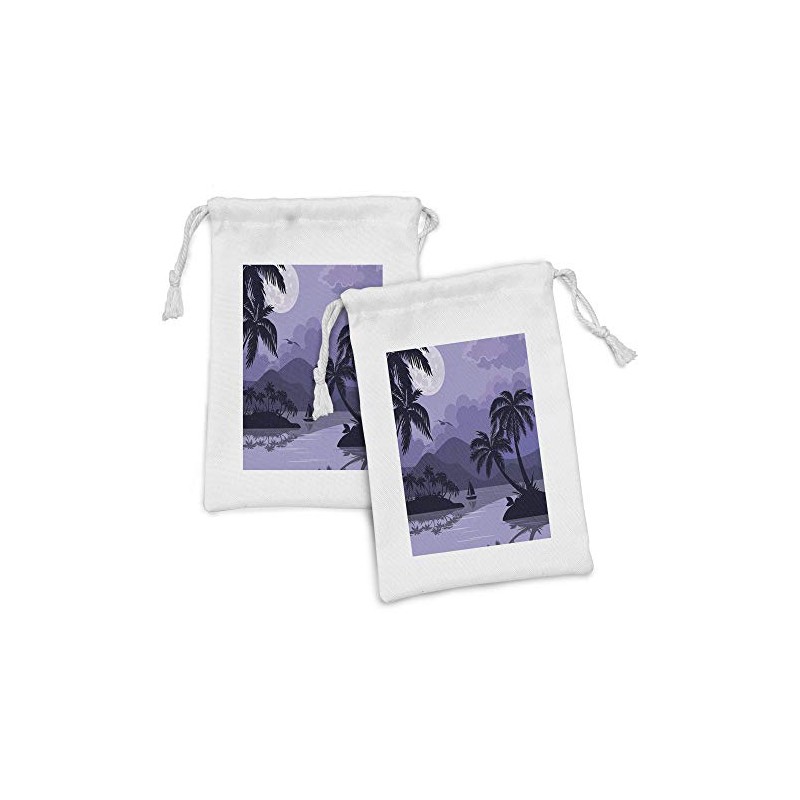 Ambesonne Tropical Fabric Pouch Set of 2, Caribbean Island Landscape at Night Full Moon Sailboat and Palm Trees, Small Drawstring Bag for Toiletries Masks and Favors, 9" x 6", Black Lavender White