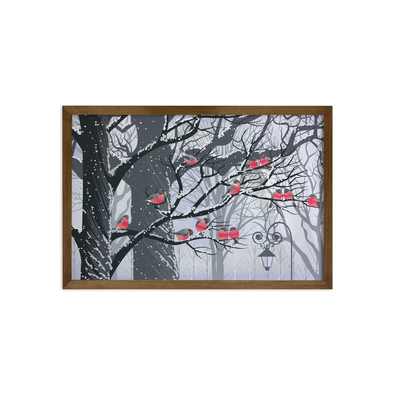 Ambesonne Winter Framed Wall Art, Bullfinches on Trees Winter City Park Snow Cold Weather Immigrant Birds Design, Fabric Decor with Teak Tone Wood Frame Home & Dorm Decor, 35" x 23", Grey Coral