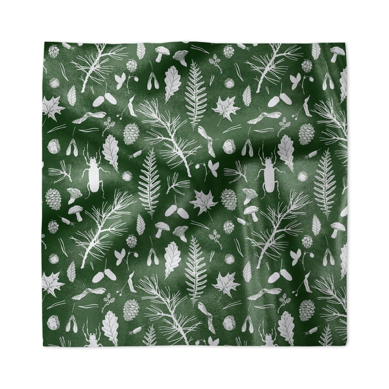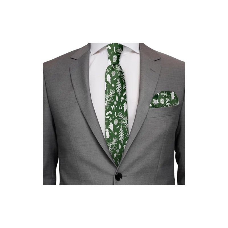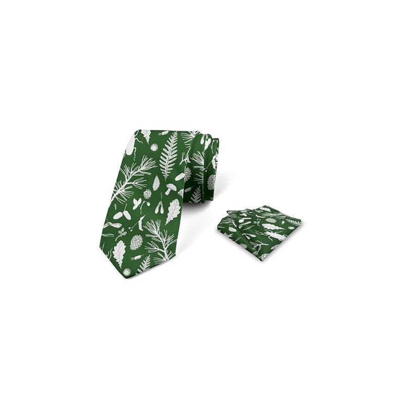 Ambesonne Woodsy Men's Tie Set, Forest Objects Leaves Twigs Pine Cones Beatles Drawn by Hand, Necktie Set Groom Handkerchief for Parties Weddings & All Occasions, Dark Forest Green White