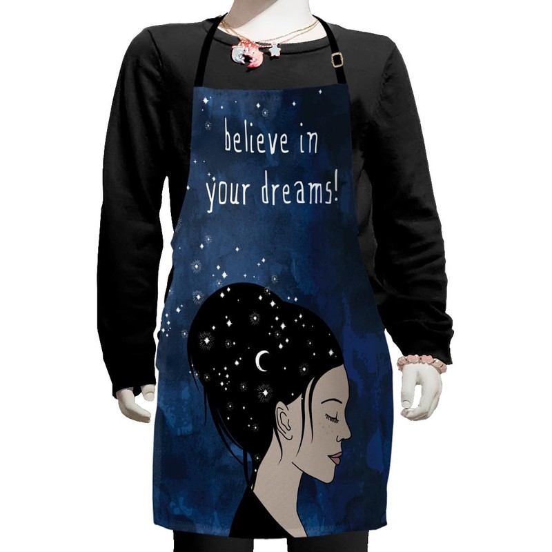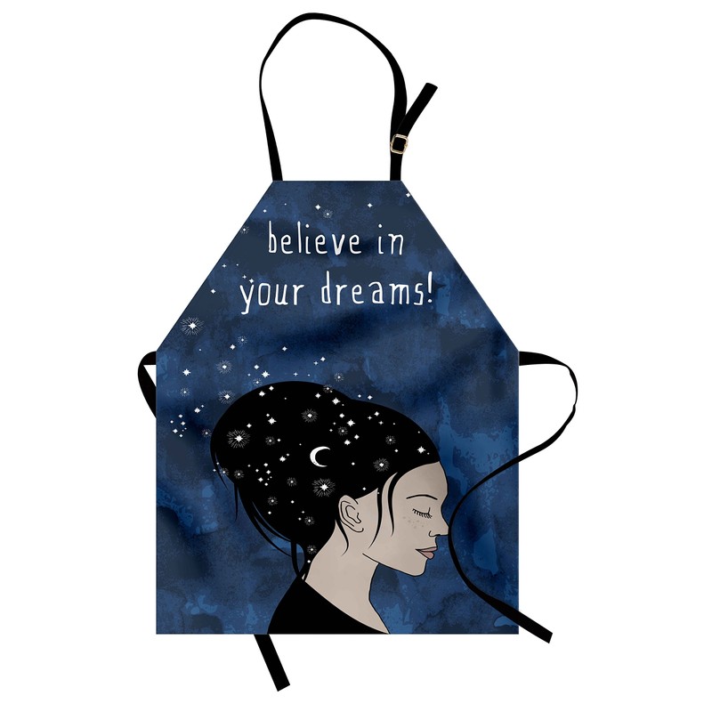 Ambesonne Wording Apron, Portrait of Woman with Dark Hair and Moon Stars Dream Believer Words Feminine Art, Small Apron Bib with Adjustable Ties for Baking Painting, Small Size, Blue