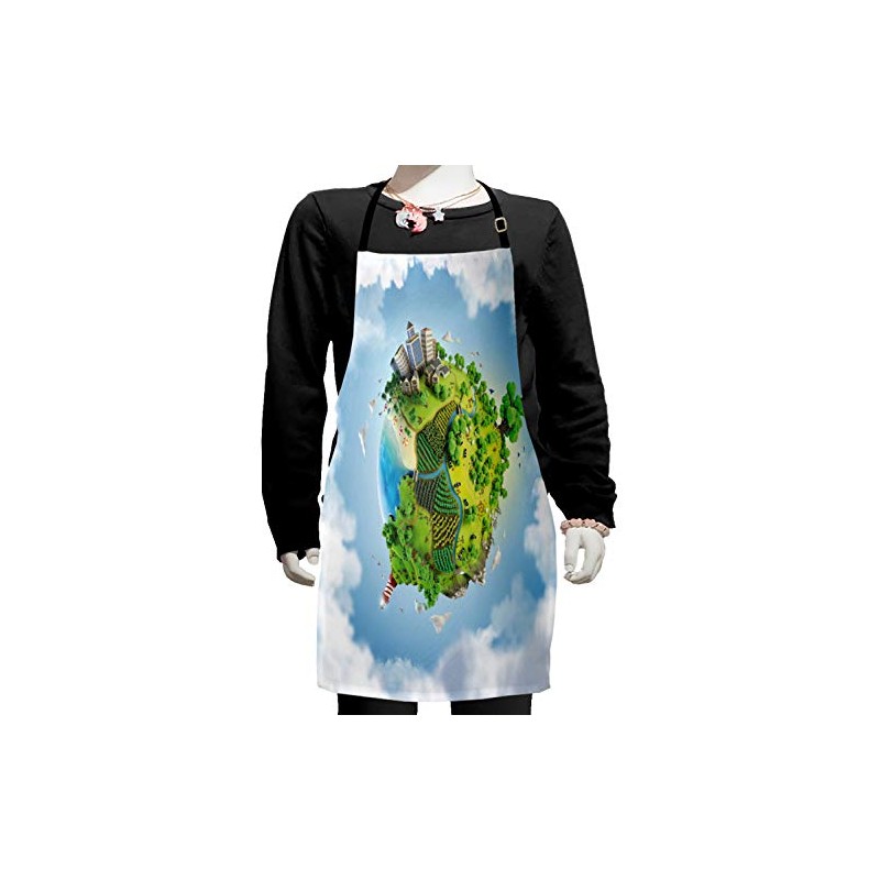 Ambesonne World Apron, Cartoon Style Globe with Greenery Peaceful Idyllic Country Cloudy Sky, Small Apron Bib with Adjustable Ties for Baking Painting, Small Size, Green Pale Blue White