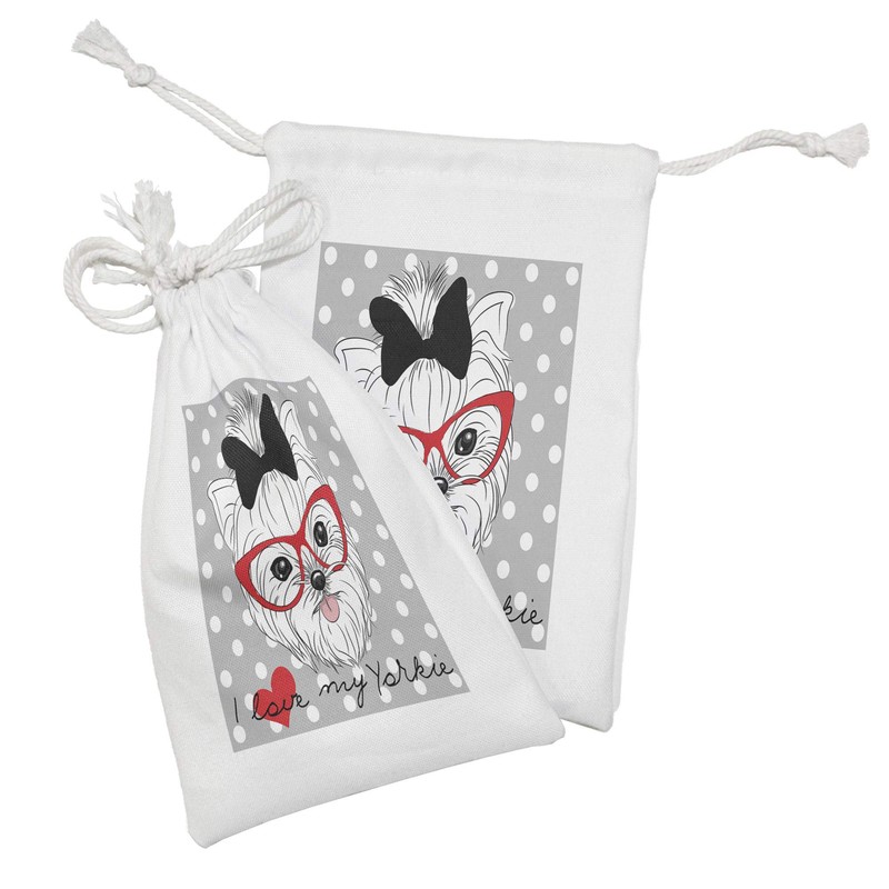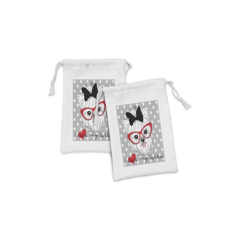 Ambesonne Yorkie Fabric Pouch Set of 2, Tilted Head Terrier I Love My Yorkie Red Nerd Glasses Love Heart Polka Dots, Small Drawstring Bag for Toiletries Masks and Favors, 9" x 6", Black White Red